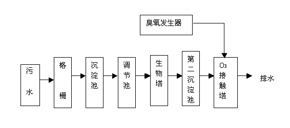 醫(yī)院污水經(jīng)過(guò)格柵、流入沉淀池,進(jìn)入調(diào)節(jié)池,由電控制柜控制污水站的全部工作,再通過(guò)泵將污水抽入塔式生物濾池,再流入接觸池,與臭氧接觸一定的時(shí)間,使其充分殺死病菌后排放。