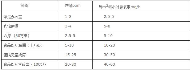 臭氧對空氣中的微生物的滅活濃度和物體表面沉降的微生物的滅活濃度,根據(jù)衛(wèi)生部1991年12月頒布的《消毒技術規(guī)范》第4.12臭氧應用章節(jié)中第8.2款消毒空氣中規(guī)定“對密閉的空氣用5~10mg/m3濃度(相當于2.5~5ppm)的臭氧作用30分鐘;對物體表面的沉降菌落需要20~30mg/m3(相當于10~15ppm)”。制藥行業(yè)應用臭氧的目的是用來代替紫外線和化學熏蒸,對整個潔凈區(qū)空氣及機械設備,介質材料表面的沉降菌落進行大消毒。需要的臭氧濃度為10~15ppm,相當于每立方空氣中臭氧含量20~30mg。