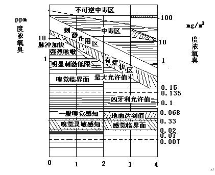 圖中刺激作用區(qū)以下范圍為無(wú)損害區(qū),即離開(kāi)臭氧環(huán)境就很快得以恢復(fù)的影響區(qū)。圖內(nèi)縮指“感覺(jué)”為嗅到臭氧的特異性氣味;“刺激”是呼吸道黏膜有反應(yīng),感到口干、咳嗽、較強(qiáng)刺激有嗓子痛、疲乏等感覺(jué),需要幾個(gè)小時(shí)得以恢復(fù)。文獻(xiàn)明確指出刺激作用區(qū)以上部分(中毒區(qū))為推測(cè)值。至今世界上無(wú)一例因臭氧中毒死亡事故。