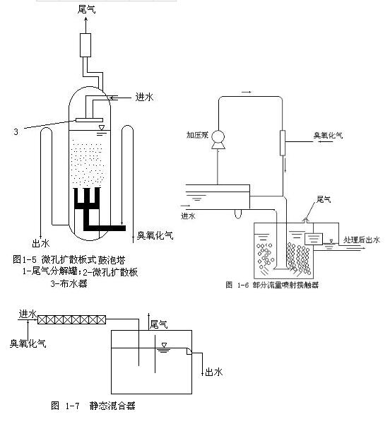 微孔擴散板式鼓泡塔見圖1-5。臭氧化氣從塔底的微孔擴散板(孔徑約15~20um)噴出,與廢水逆流接觸;塔中可裝填瓷環(huán)、塑料環(huán)等填料,以改善水氣接觸條件。這種設(shè)備的特點是可較長時間保持一定的臭氧濃度,有利于臭氧與水中污染物充分反應(yīng)。此外,該設(shè)備具有較大的液相容積,氣量調(diào)節(jié)容易。