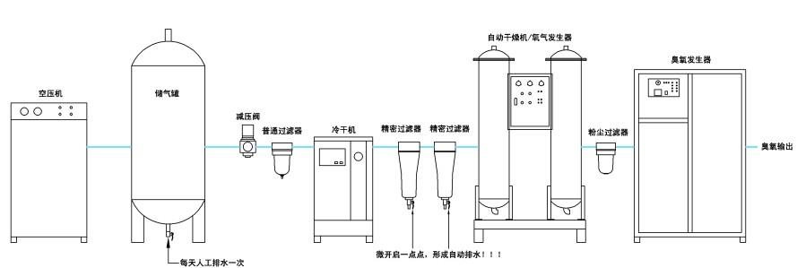 優(yōu)質(zhì)的電暈放電法—臭氧系統(tǒng),是由1臺臭氧發(fā)生器,由1臺無油空氣壓縮機(jī)、1臺氧氣發(fā)生器系統(tǒng),1套空氣過濾系統(tǒng)及冷干系統(tǒng)組成。